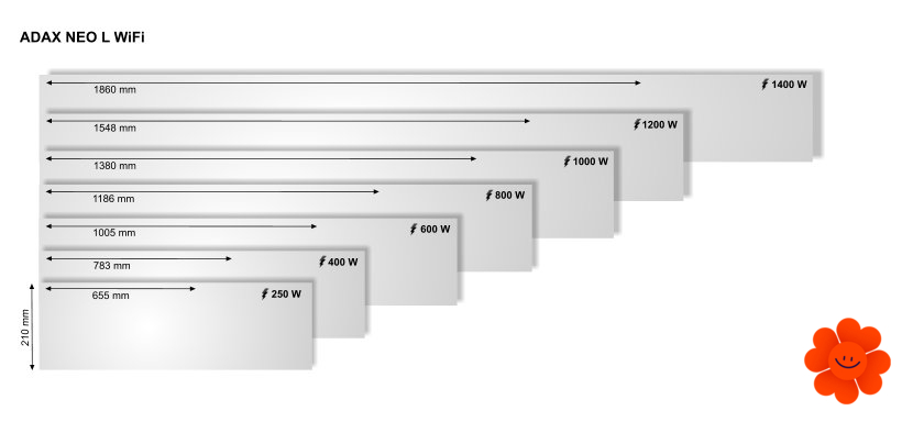 Heizgeräte ADAX NEO WIFI sind in verschiedenen Leistungen und 2 Höhen verfügbar: