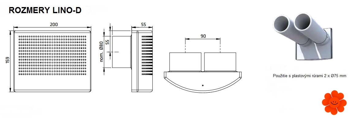 Das Ventil LINO-D ist für die Verwendung mit den flexiblen Kunststoffrohren 2 x Ø75 mm bestimmt. (sehe Galerie)
