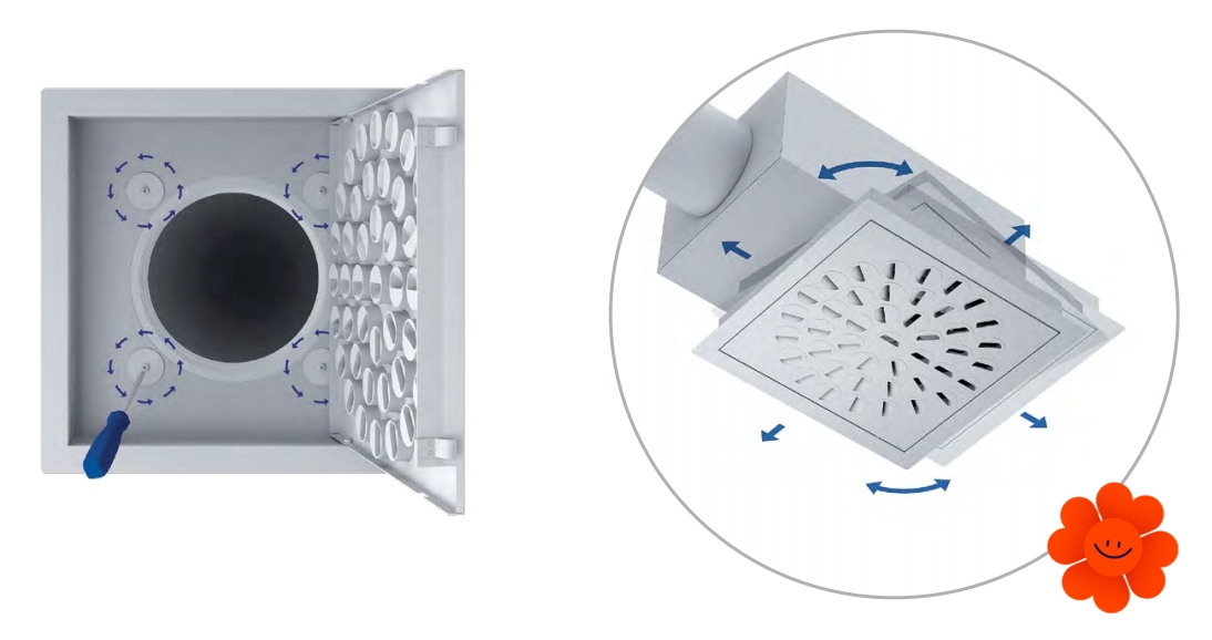 Eine der bedeutendsten Eigenschaften von OLE ist die patentierte Fähigkeit den Anschluss nach den Seiten zu schieben. Dank dieser Eigenschaft sind die Installationen viel einfacher. In der Praxis bedeutet das, dass wenn Sie das Rohr bei der Montage nicht genau in die Mitte der Öffnung für den Luftauslass stecken, kann OLE seine Öffnung anpassen, ohne die Notwendigkeit das Rohr zu verschieben.