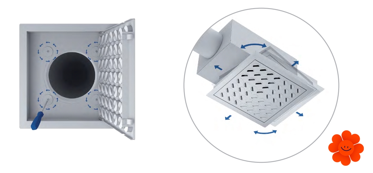 Eine der bedeutendsten Eigenschaften von OLO ist die patentierte Fähigkeit den Anschluss nach den Seiten zu schieben. Dank dieser Eigenschaft sind die Installationen viel einfacher. In der Praxis bedeutet das, dass wenn Sie das Rohr bei der Montage nicht genau in die Mitte der Öffnung für den Luftauslass stecken, kann OLO seine Öffnung anpassen, ohne die Notwendigkeit das Rohr zu verschieben.