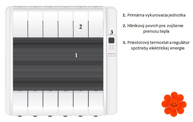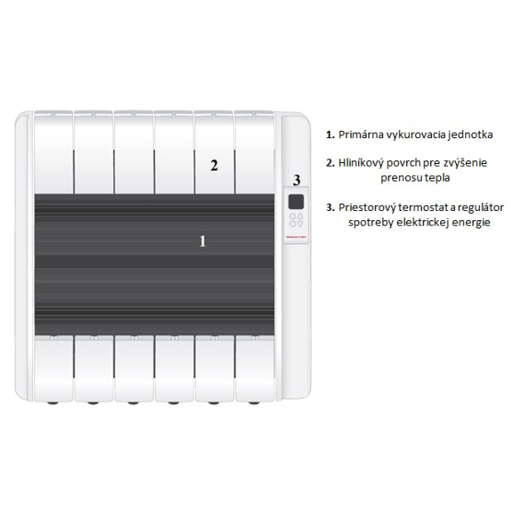 Der Heizkörper hat einen eingebauten Thermostat, der genau die Raumtemperatur mit der Abweichung± 0,1 °C misst. Während des Betriebs erhält der Heizkörper die möglichst niedrigste Oberflächentemperatur, um es nicht zu den Verbrennungen oder die Verringerung der Raumluftfeuchtigkeit kommt. Nach der Abschaltung der Elektroenergie kühlt sich der Heizkörper nach 30 - 40 Minuten ab.