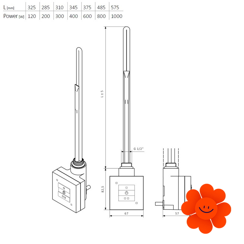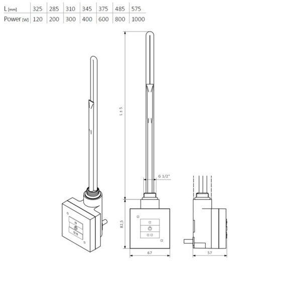 Betriebsspannung: 230V/50Hz, Schutzklasse I., Temperaturbereich 50% und 100% der Nennheizleistung (2 Stufen), Anschlussgewinde G1/2" außen (am Heizstab), Heizstableistung 800W.