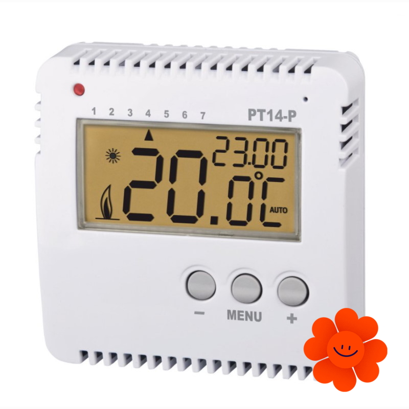 Der Elektrobock PT14-P ist ein programmierbarer, digitaler Raumthermostat zur Temperaturregelung in Kombination mit anderen Heizgeräten wie Infrarotpaneelen, elektrischen Konvektoren, Ventilatoren oder elektrischen Heizkörpern. Die Bedienung erfolgt einfach über zwei Tasten, die die Temperatur in 0,5 °C-Schritten regeln. Der Thermostat verfügt über erweiterte Funktionen mit der Möglichkeit, ein Wochenprogramm mit 6 Temperaturänderungen pro Tag zu programmieren. Durch die Regelung des angeschlossenen Geräts können bis zu 30 % Energie eingespart werden.