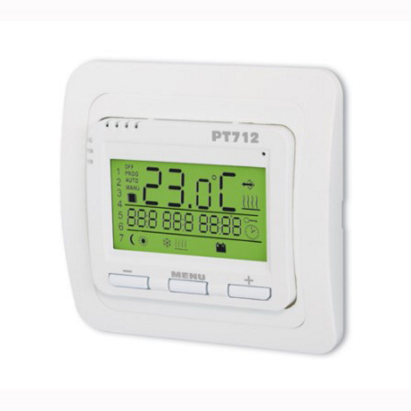 Elektrobock PT712 ist ein digitaler Thermostat zur Regelung elektrischer Fußbodenheizungen wie Heizkabel, Heizmatten oder Heizfolien. Der Thermostat steuert die Fußbodenheizung anhand der Raumtemperatur (die Version PT712-EI mit externem Sensor ermöglicht die Regelung nach der Bodentemperatur). Durch den Einsatz des Thermostats lässt sich zu bestimmten Zeiten ein angenehmes Raumklima erreichen und gleichzeitig die Heizkosten senken.