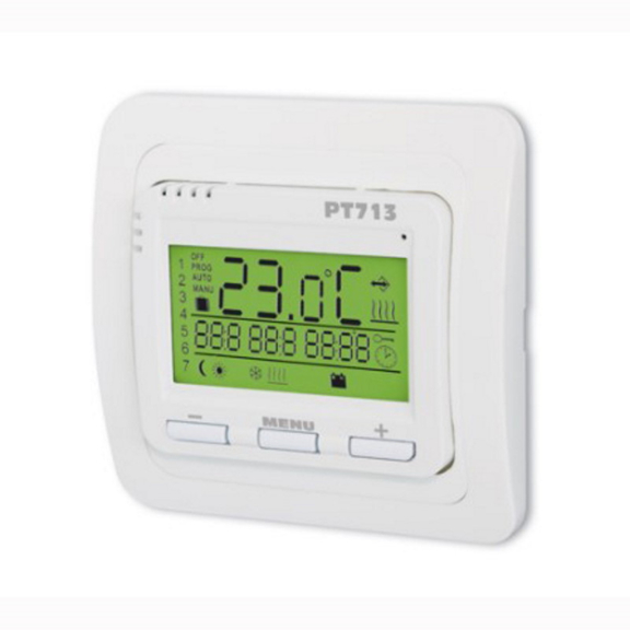 Der Elektrobock PT713 ist ein digitaler Thermostat zur Regelung elektrischer Fußbodenheizungen wie Heizkabel, Heizmatten oder -folien. Der Thermostat regelt die Fußbodenheizung nach der Raumtemperatur (PT713-EI mit externem Sensor kann die Temperatur nach der Fußbodentemperatur steuern). Der Thermostat arbeitet mit PI-Regelung, wodurch starke Temperaturschwankungen vermieden werden und gleichzeitig die benötigte Zeit zur Erreichung der gewünschten Temperatur berechnet werden kann. Durch die Verwendung des Thermostats kann ein angenehmes Raumklima zu bestimmten Zeiten erreicht und gleichzeitig Heizkosten gesenkt werden.