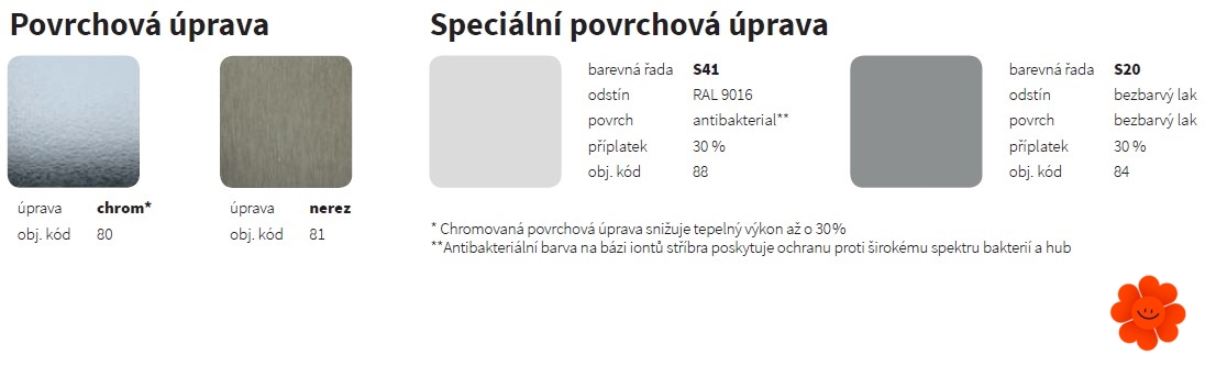 Im Angebot kommt auf seine Kosten jeder, der die Chromoberfläche oder Oberflächenbehandlung aus dem rostfreien polierten Edelstahl bevorzugt. Die Oberflächenbehandlung aus dem Chrom können nur die markierten Heizkörpertypen haben. Das Chrom wird auf das verfertigte Produkt galvanisch angelegt.
