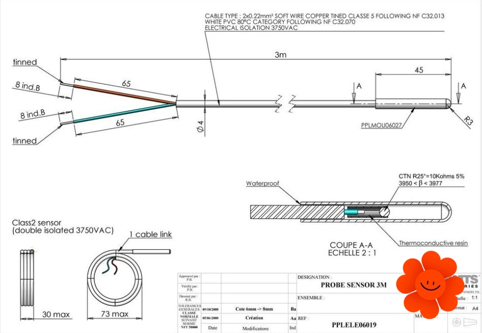 Der Fußbodenfühler eignet sich zum Empfänger Watts V23 und zu Thermostaten Fenix Watts V22 und Fenix TFT.