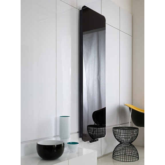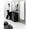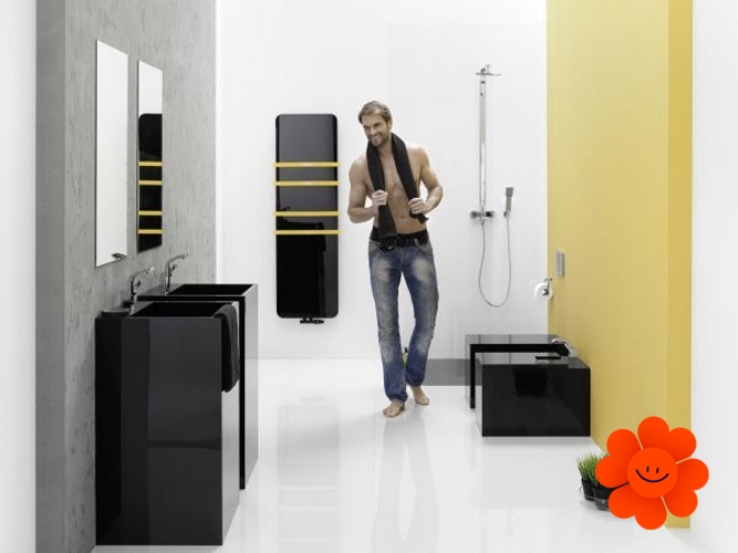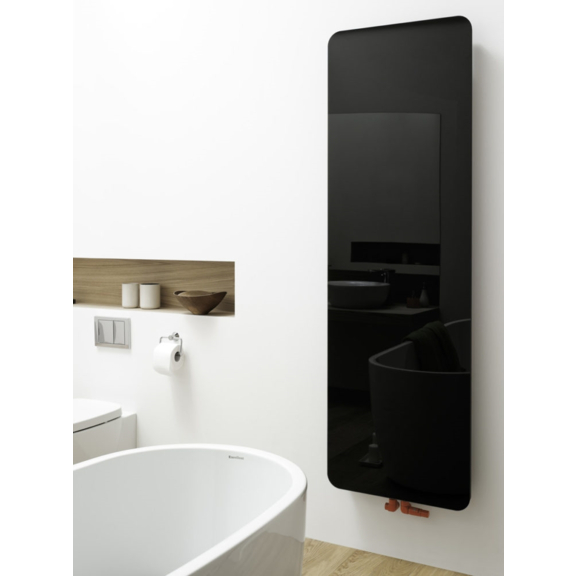 Der Heizkörper Indivi New ist in der Version Glas in Farben blau und schwarz und mit einer Spiegelplatte, aber auch in zwei Varianten: silbern und Grafit im Angebot. Der übliche untere Zentralanschluss mit dem Abstand von 50 mm (D50). Ein diskreter Lüftungssystem: seine elegante Konstruktion verbirgt die Entlüftungsöffnung.