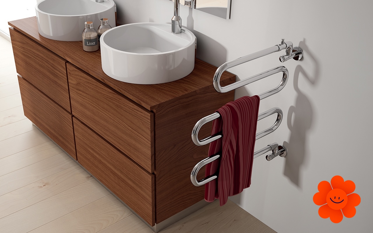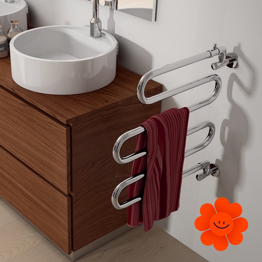 Standardausrüstung: Heizkörper und Handtuchtrockner aus verchromtem Messing mit Ventilen, Haken und oberem Entlüftungsventil • kreisförmiges Messingrohr mit Durchmesser von 25 mm • Ventile mit hydraulischem Verbinder.