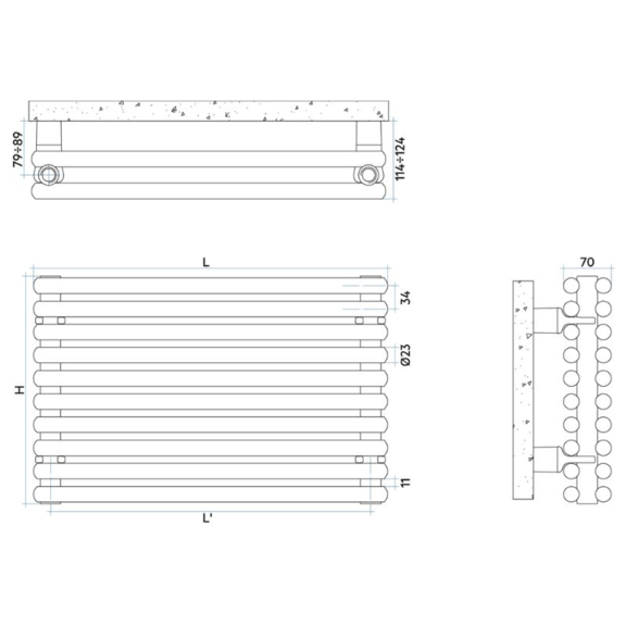 Das Modell Arpa 23_2 zeichnet sich durch eine modulare Bauweise aus, die es ermöglicht, Größe und Leistung nach Bedarf anzupassen. Der Heizkörper ist in 14 verschiedenen Längen erhältlich, in Konfigurationen von 4 bis 40 Elementen, mit einer Heizleistung von 211 bis 3062 W. Es ist auch eine einreihige Version des Heizkörpers verfügbar.
