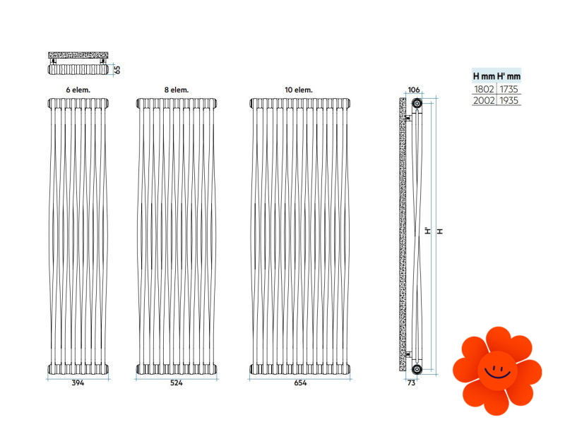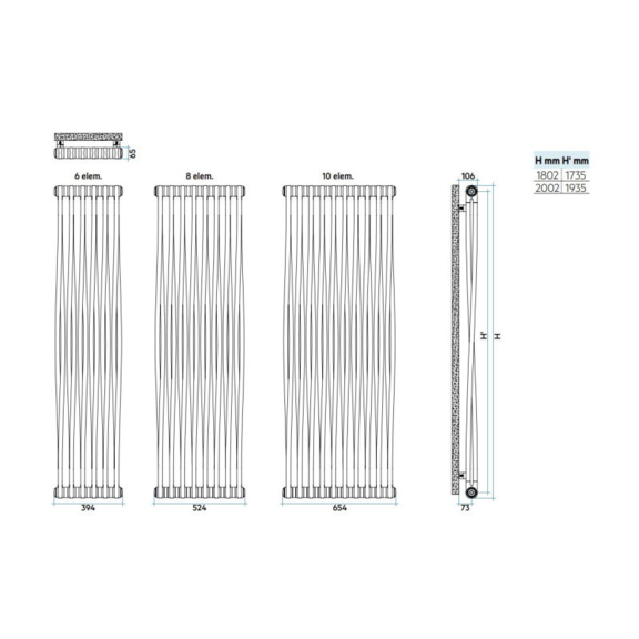 Tesi Memory hat eine Tiefe von 65 mm und wird in zwei verschiedenen Höhen mit 6, 8 oder 10 Zellen hergestellt. Die Heizkörper werden mit höchster Präzision aus hochwertigen und langlebigen Materialien hergestellt und haben eine 10-jährige Garantie auf Farbe und Dichtheit.