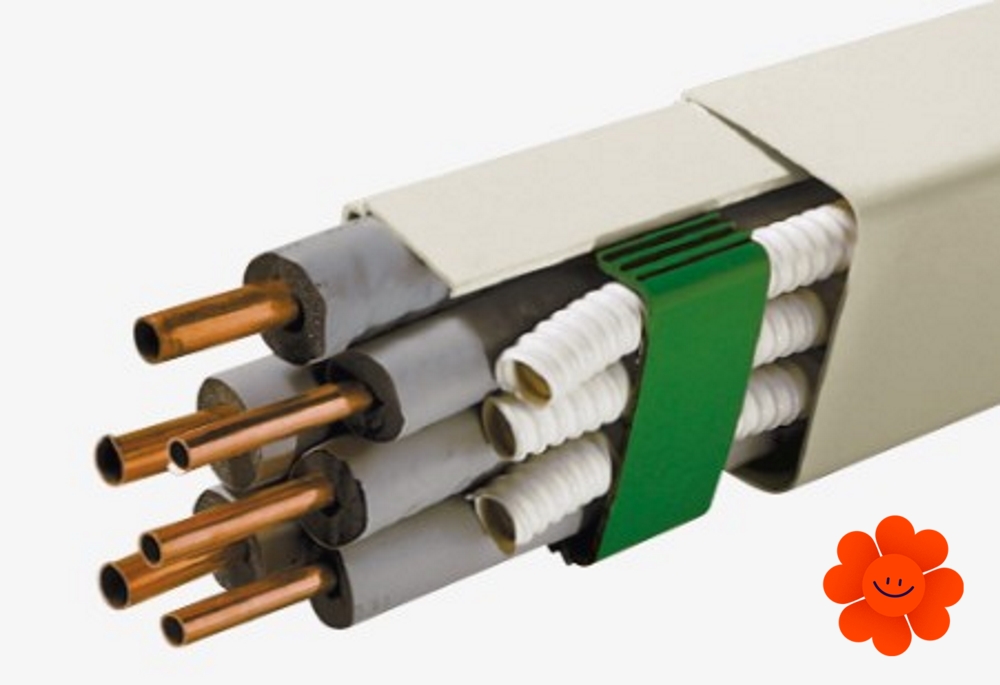 Mit der Schutzfolie bezogener Kanal für die Verlegung von Klimaleitungen (Kupferrohr, Kondensat, Stromkabel).
