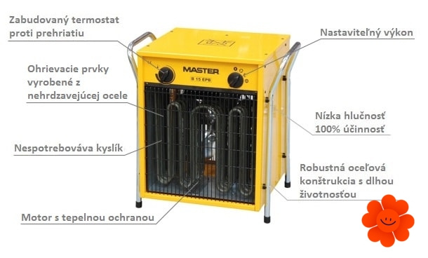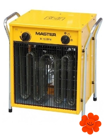 Das Luftaustauschvolumen das Heizgerätes Master B 15 EPB ist 1.700 m3/h. Der eingebaute Umschalter ermöglicht die Umschaltung zwischen den Leistungen - Lage 1 für das Abschalten, Lage 2 für den Lüfter (Möglichkeit der Umschaltung auf Sommer- und Winterregime), Lage 3 für die Leistung 7,5 kW (Heizleistung 6.450 kcal/h), Lage 4 für die Leistung 15,0 kW (Heizleistung 12.900 kcal/h). Dieses elektrische Heizgerät bietet dem Verbraucher ein günstiges Verhältnis von Preis : Leistung an, kein Sauerstoffverbrauch, es produziert keinen Rauch oder Geruch und ist geräuscharm. Die Motoren sind mit dem Wärmeschutz ausgestattet und die widerstandsfähige metallische Ausführung garantiert die Langlebigkeit