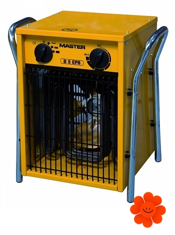 Das Luftaustauschvolumen das Heizgerätes Master B 5 EPB ist 510 m3/h. Der eingebaute Umschalter ermöglicht die Umschaltung zwischen den Leistungen - Lage 1 für das Abschalten, Lage 2 für den Lüfter (Möglichkeit der Umschaltung auf Sommer- und Winterregime), Lage 3 für die Leistung 2,5 kW (Heizleistung 2.150 kcal/h), Lage 4 für die Leistung 5,0 kW (Heizleistung 4.300 kcal/h). Dieses elektrische Heizgerät bietet dem Verbraucher ein günstiges Verhältnis von Preis : Leistung an, kein Sauerstoffverbrauch, es produziert keinen Rauch oder Geruch und ist geräuscharm. Die Motoren sind mit dem Wärmeschutz ausgestattet und die widerstandsfähige metallische Ausführung garantiert die Langlebigkeit.