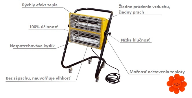 Der Infrarotstrahler HALL 3000 ist ein statisches Gerät, das für die Heizung von Innen- und Außenräumen, Wohnräumen oder Arbeitsräumen bestimmt ist. Der Infrarotstrahler funktioniert nach dem Prinzip der Wärmestrahlung, d. h. in seiner Umgebung werden primär Gegenstände erwärmt, von welchen die Luft sekundär erwärmt wird. Der Infrarotstrahler sorgt nach seiner Einschaltung für das sofortige Gefühl der Wärme.