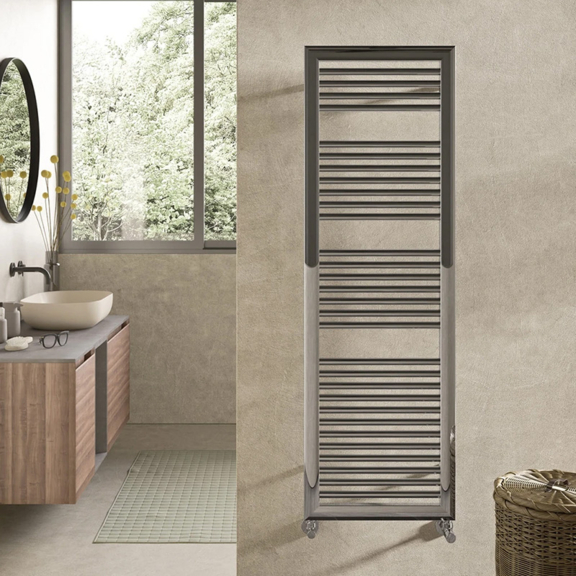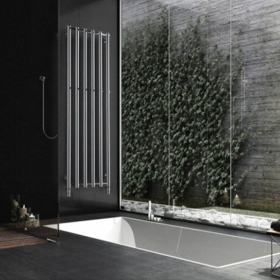 P.M.H. Pluto X ist ein Chrom-Heizkörper mit eckigen Rohrprofilen, der zu den schmalsten Heizkörpern am Markt gehört.