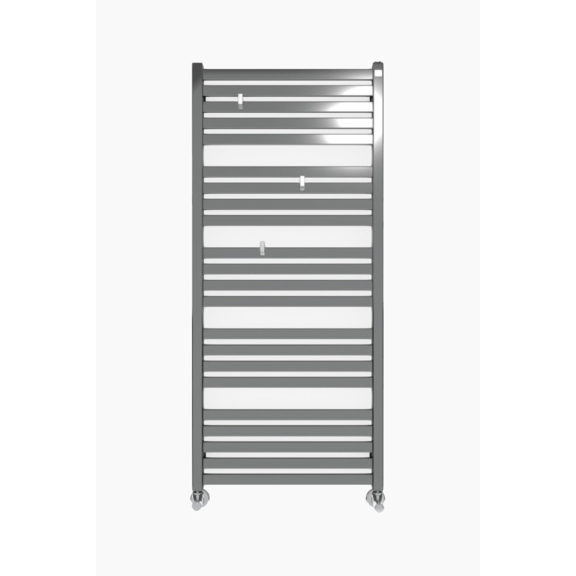 Der Heizkörper ist mit eckigen Haken in zwei Reihen zum einfachen Hängen von Badetüchern ausgerüstet.