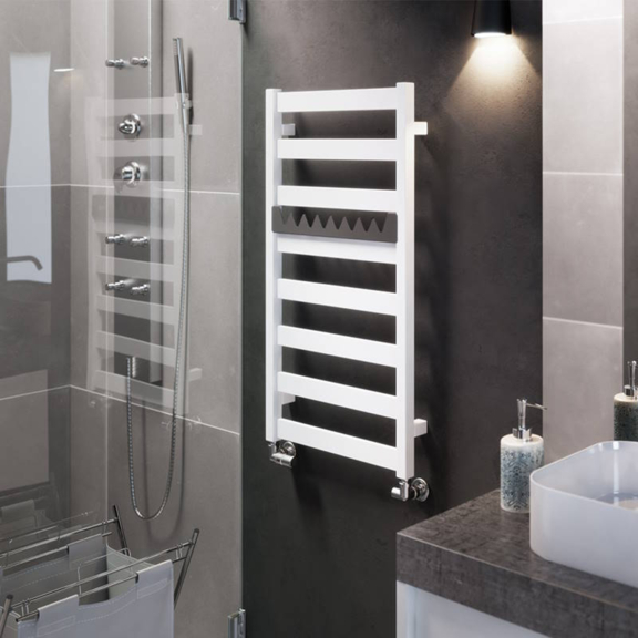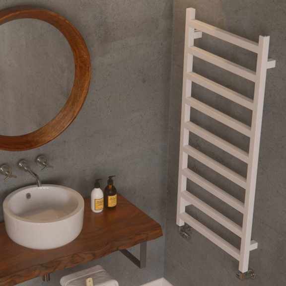 Der ungewöhnliche, raumsparende, elegante Heizkörper P.M.H. Rosendal Massive ist die massive Ausführung des Heizkörpers Rosendal mit Haken für einfaches Hängen von Badetüchern.