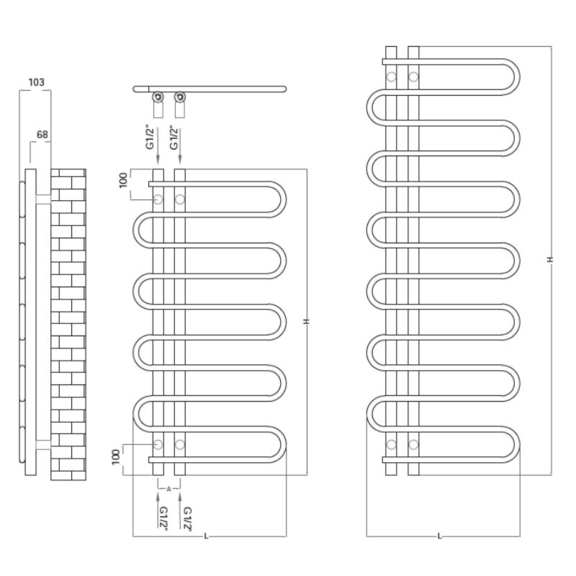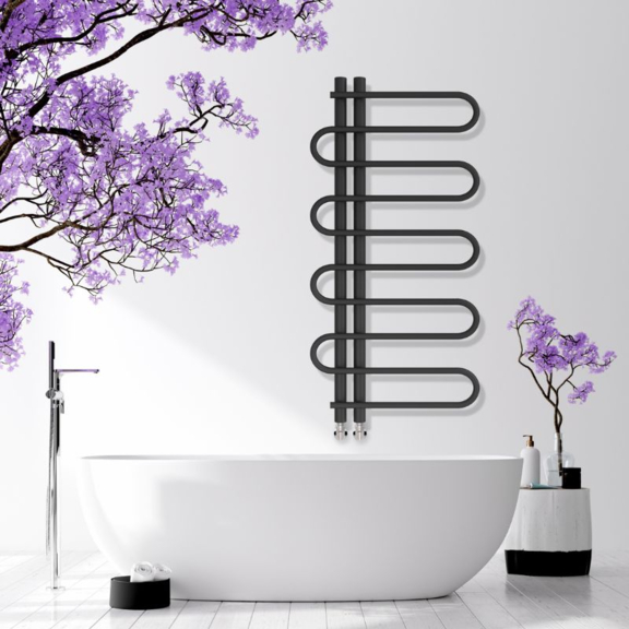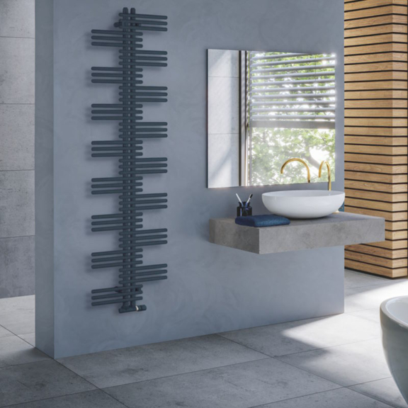 Auf den ersten Blick fallen die horizontalen Bögen auf, die von zwei vertikalen Kollektoren ausgehen und an die Strömung eines Flusses erinnern, und gleichzeitig ein bequemes Aufhängen von Handtüchern ermöglichen.