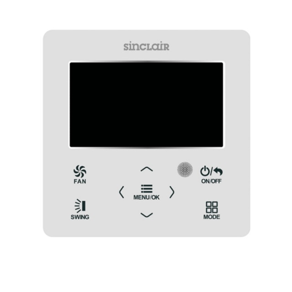 Diese wählbare Kabelfernbedienung kann mit einem Kommunikationskabel direkt an die Innenklimaeinheit Sinclair angeschlossen werden. Mittels dieser Fernbedienung können Wochen- oder Tages-Timer sowie ein Programm für zwei Wochen eingestellt und einzelne Funktionen oder Tasten gesperrt werden.