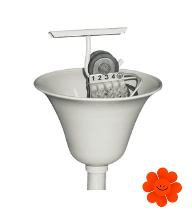 Klemmerbett ist zugänglich nach der Entfernung der Kabelabdeckung, die sich über die Aufhängestange rückt und eine Entlastungschelle gegen den Ausriss von Kabeln enthält. Verbindung entweder mit dem Kabel unter Putz oder auf Putz.