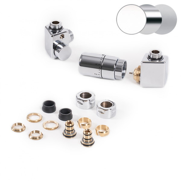 Manuelles Design-Eckventilset mit einer Abänderungsmöglichkeit zum thermostatischen Ventil – Paar 0613+0673 (ein Zuleitungsventil, ein Ableitungsventil und 2x Gewinde).
