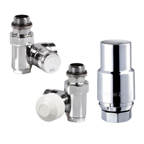 Rechtes thermostatisches Design-Winkelset – Paar 0641+0639+N090 (ein Zuleitungsventil, ein Ableitungsventil, ein Kopf Domus und 2x Gewinde).