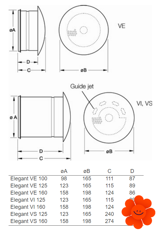 Elegant ist verfügbar in Größen ø 100, ø 125 und ø 160 mm und in fünf verschiedenen Modellen: