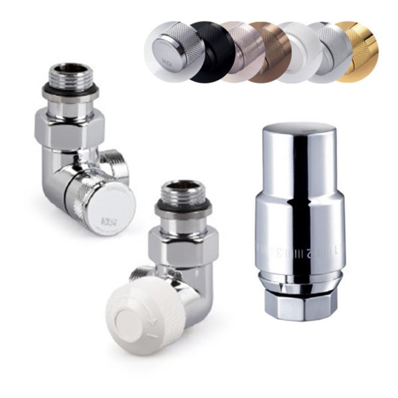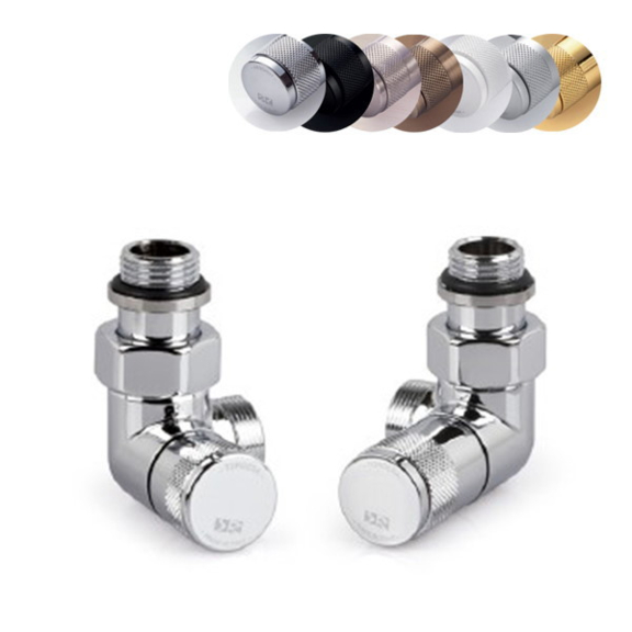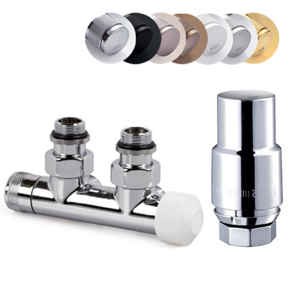 Das thermostatische Designeckset enthält: thermostatisches Ventil, Abschlussventil, Adapter AL-PEX ∅ 16x2 und Kupfer ∅ 15.