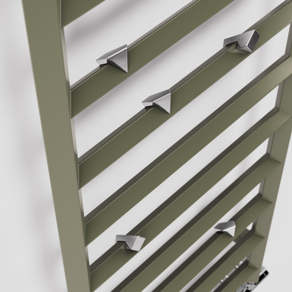 Einzigartiger moderner Badheizkörper mit Rohren mit Diamantquerschnitt. Die einzigartige Form mit sichtbaren Kanten reflektiert das Licht gut, wodurch der Körper optisch leicht bleibt. Das Model ist auch in lackierter oder Chromversion erhältlich.