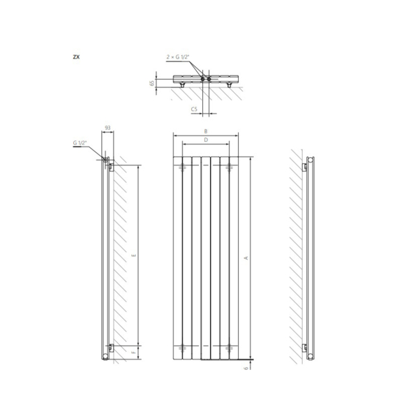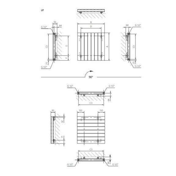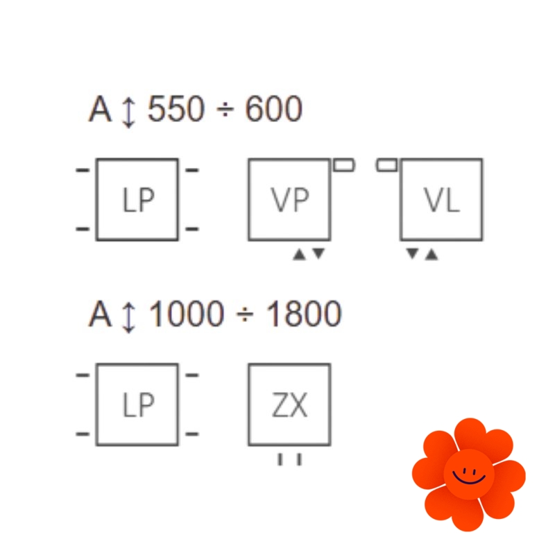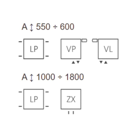 Bei der vertikalen Ausführung des Heizkörpers mit einer Höhe von 550–600 mm sind die Anschlüsse LP, VP, VL verfügbar, während bei Höhen von 1000–1800 mm nur die Anschlüsse LP und ZX verwendet werden können.