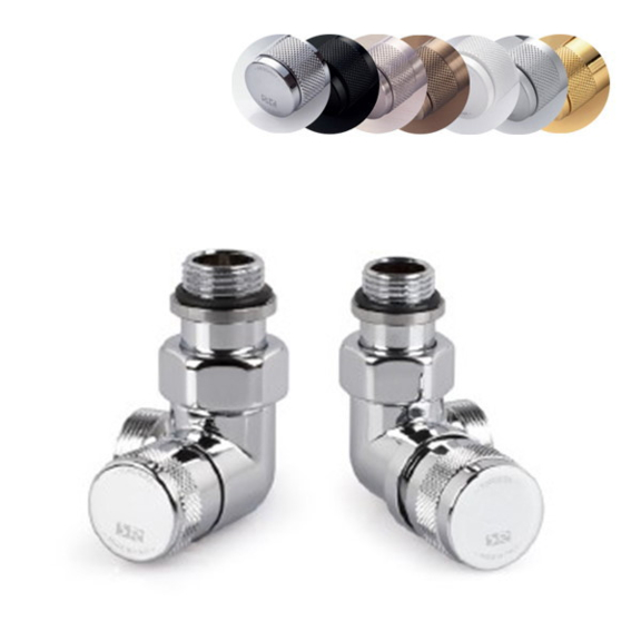 Thermostatisches Design-Winkelset der Marke Terma mit einer wählbaren maßgetreu hergestellten Farbausführung, dank der man das Set zu einem beliebigen Heizkörper oder einem anderen Zubehör anpassen kann.
