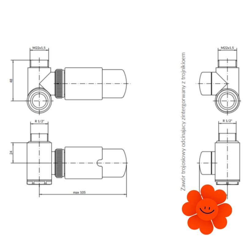 - thermostatisches Winkelventil mit Möglichkeit eines kombinierten Anschlusses
