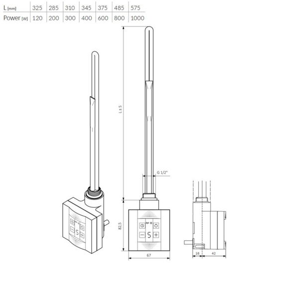 Betriebsspannung. 230V/50 Hz, Schutzklasse I., Temperaturspanne 30-60°C (Einstellung in Schritten zu jeweils 5°C, mit App zu jeweils 1°C), Außenanschlussgewinde G1/2“ (auf dem Heizrohr), Heizrohrleistung 120-1000 W.