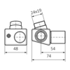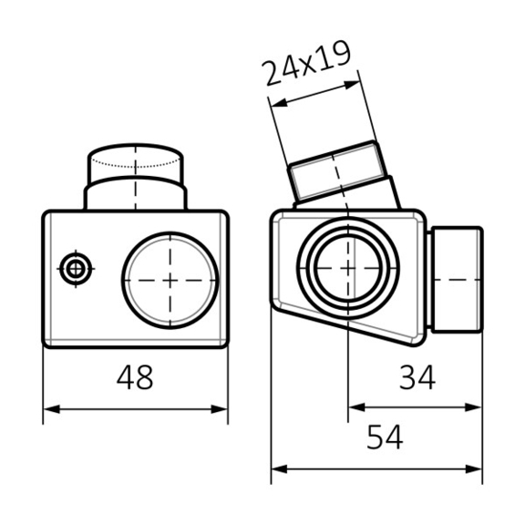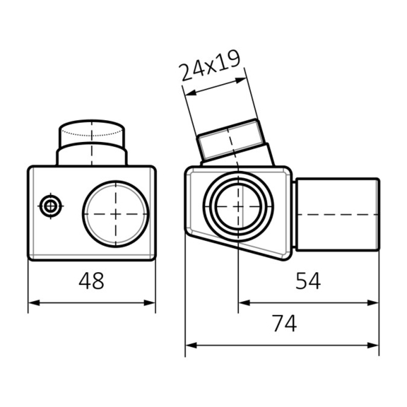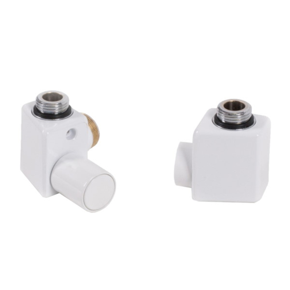 Rechtes manuelles Winkelset enthält: ein Regelventil, ein Absperrventil, Adapter AL-PEX ∅ 16x2 und Kupfer ∅ 15.