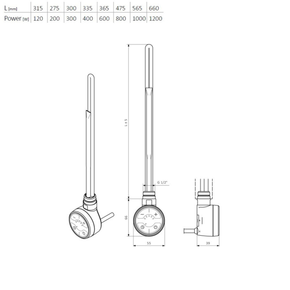 Betriebsspannung. 230V/50 Hz, Schutzklasse I., Temperaturspanne 30-60 °C (in Schritten jeweils zu 5°C), Außenanschlussgewinde G1/2“ (auf dem Heizrohr), Heizrohrleistung 120-1200 W.