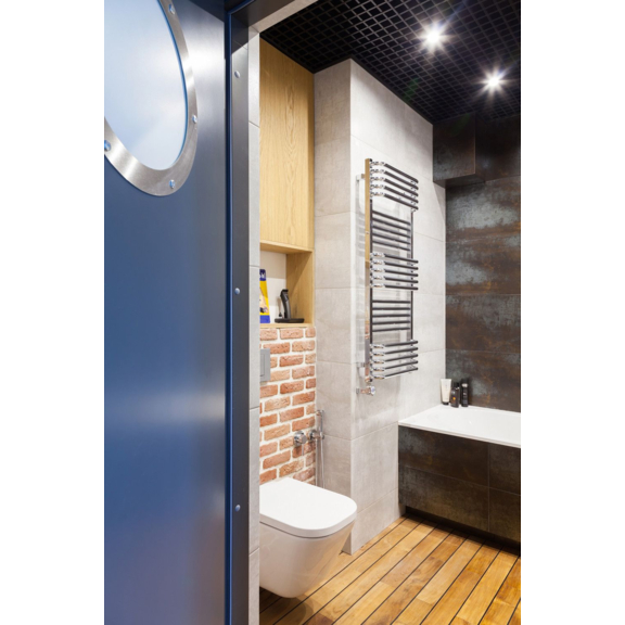Der effektive und praktische elektrische Heizkörper Pola für Badezimmer. Das gebogene Rohr und der Raum zwischen seinen Teilen erleichtern das Hängen von Textilien zum Trocknen.
