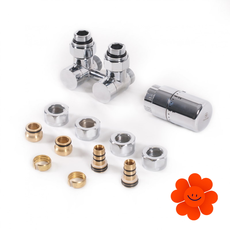 Thermostatischer Mitteleckset beinhaltet: hermostatisches Ventil, Absperrventil, thermostatischen Kopf SLIM, Adapter AL-PEX ∅ 16x2, Kupfer ∅ 15 und Reduzierstück zum Gewinde G 1/2".