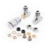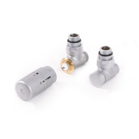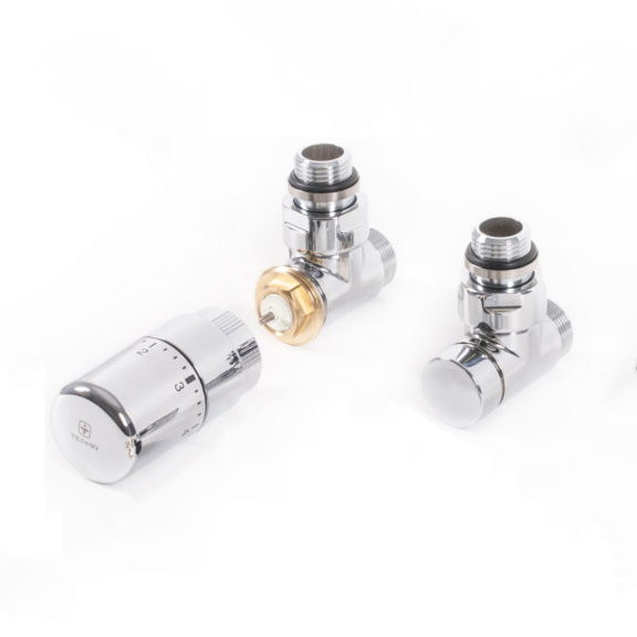Thermostatisches Design-Eckventilset enthält: ein thermostatisches Ventil, ein Absperrventil, einen thermostatischen Kopf SLIM, Adapter AL-PEX ∅ 16x2 und Kupfer ∅ 15.