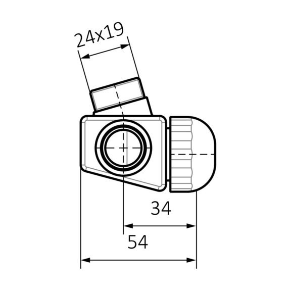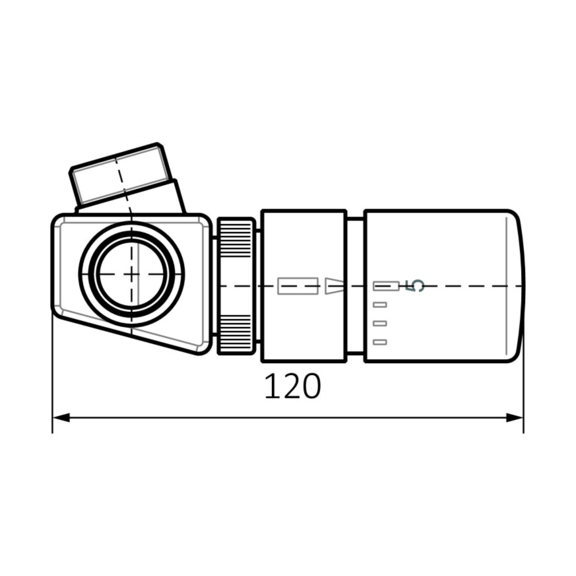 Linkes thermostatisches Winkelset enthält: ein thermostatisches Ventil, ein Absperrventil, einen thermostatischen Kopf SLIM, Adapter AL-PEX ∅ 16x2 und Kupfer ∅ 15.