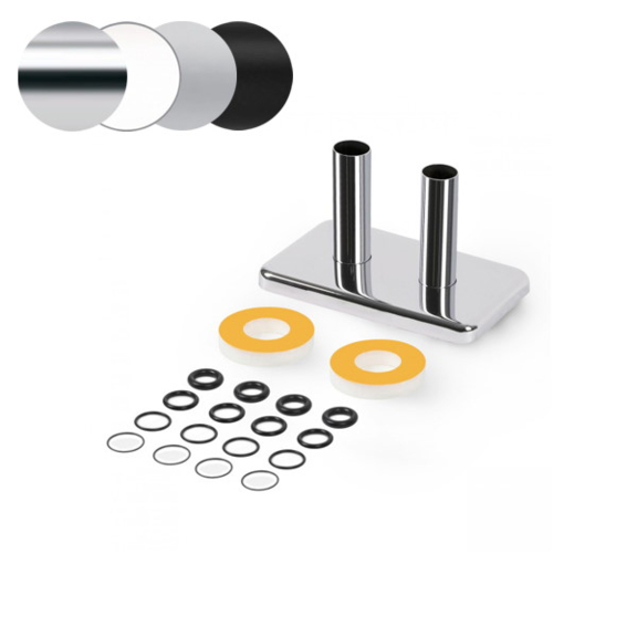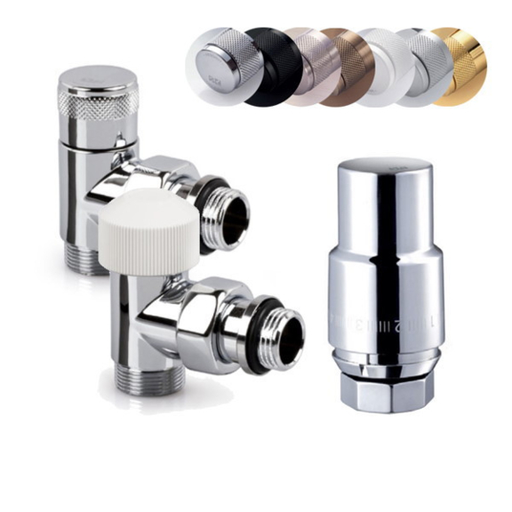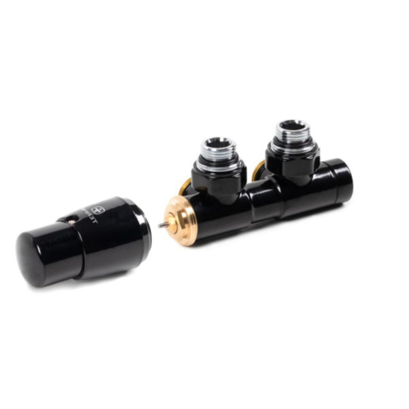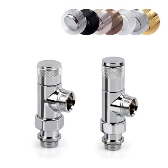 Thermostatisches Design-Eck-Mittelset der Marke Terma mit einer wählbaren maßgetreu hergestellten Farbausführung, dank der man das Set zu einem beliebigen Heizkörper oder einem anderen Zubehör anpassen kann.