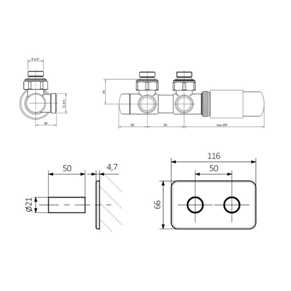 Terma TWINS ALL IN ONE Thermostatisches Eck-Mittelventilset