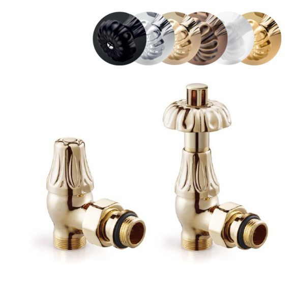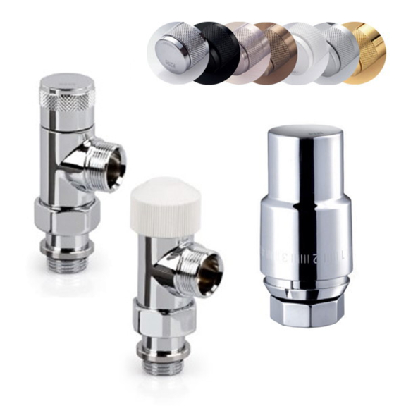 Thermostatisches Design-Eck-Mittelset der Marke Terma mit einer wählbaren maßgetreu hergestellten Farbausführung, dank der man das Set zu einem beliebigen Heizkörper oder einem anderen Zubehör anpassen kann.
