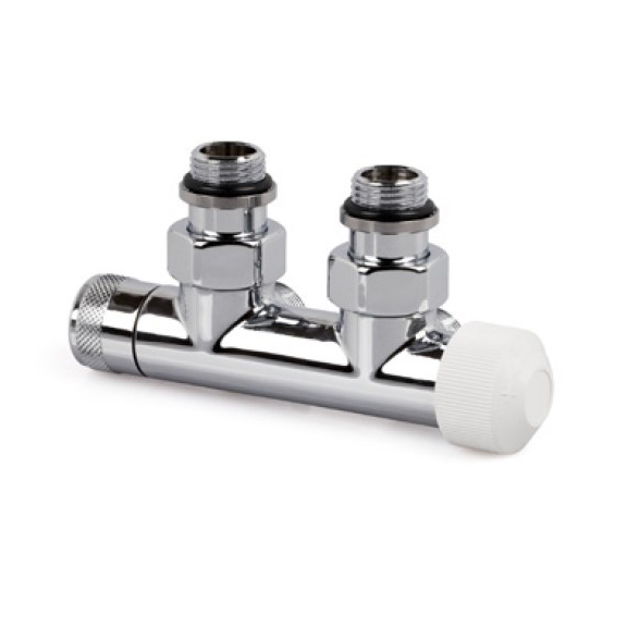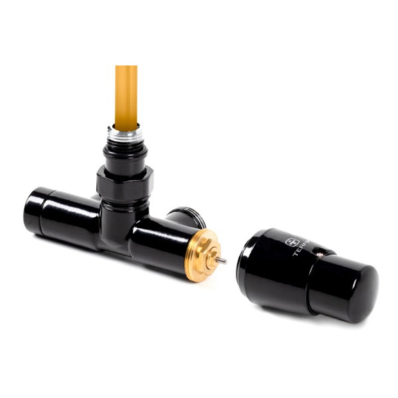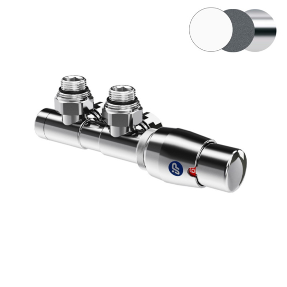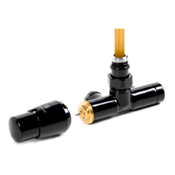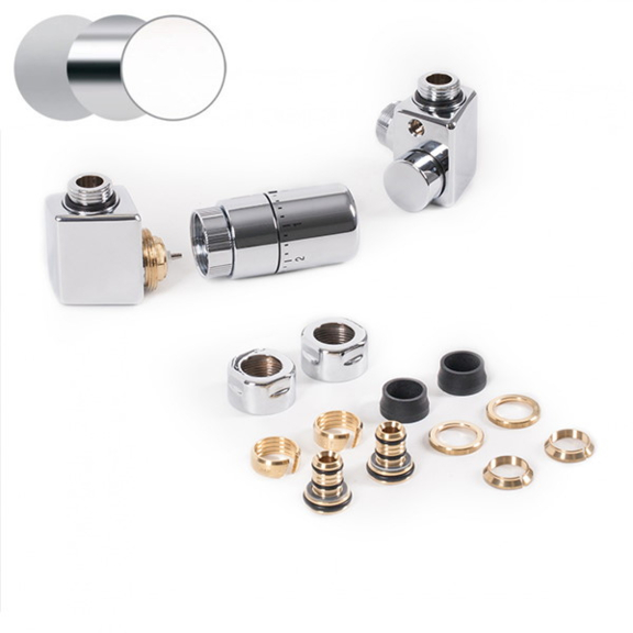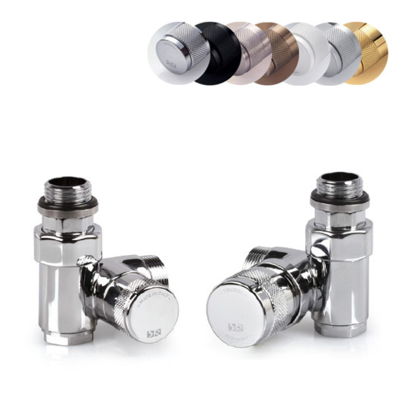 Thermostatisches Eck-Mittel-Design-Set mit einer Lanze Marke Terma mit einer wählbaren maßgetreu hergestellten Farbausführung, dank der man das Set zu einem beliebigen Heizkörper oder einem anderen Zubehör anpassen kann.