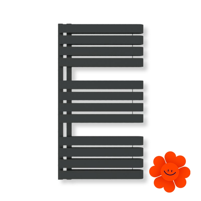 Durch die ungewöhnliche, einseitige Platzierung der Kollektoren erhält ein einfacher Badheizkörper ein völlig neues Aussehen. Trotz der asymmetrischen Struktur bleibt die Form optisch stabil und ausgewogen. Große Abstände zwischen den Rohrabschnitten und eine hohe Heizleistung ermöglichen die freie Nutzung des Heizkörpers als Trockner.