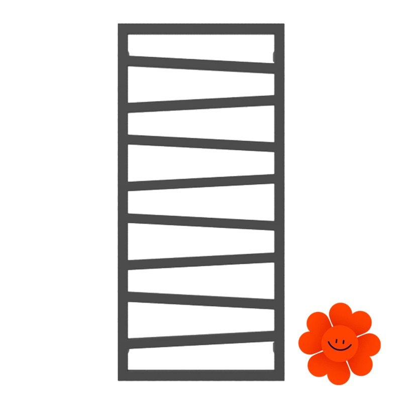 Ein moderner Heizkörper aus zueinander ausgerichteten Vierkantrohren. Die flache Form mit asymmetrisch angeordneten Profilen zieht die Blicke auf sich und ist ein originelles Element des Badezimmers.