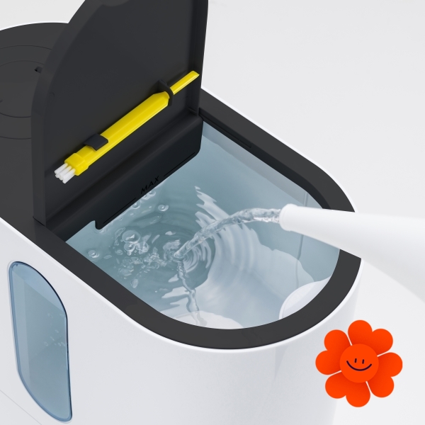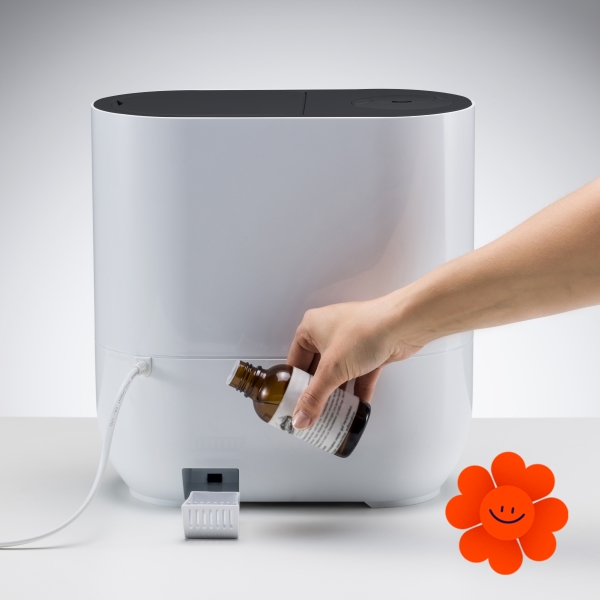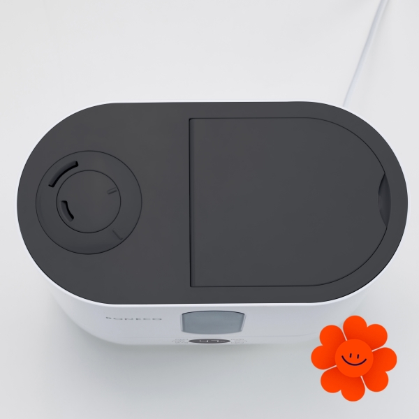 Den Befeuchter kann man berührungslos von seinem oberen Teil anfüllen.  Er wird durch LED Display gesteuert. Der Modus „AUTO“ automatisch befeuchtet die Raumluft bis die optimale relative Feuchtigkeit 50 %. Diese Werte werden durch den eingebildeten Feuchtigkeitsmesser gemessen und man kann die Werte auch manuell nach dem Bedarf stellen.