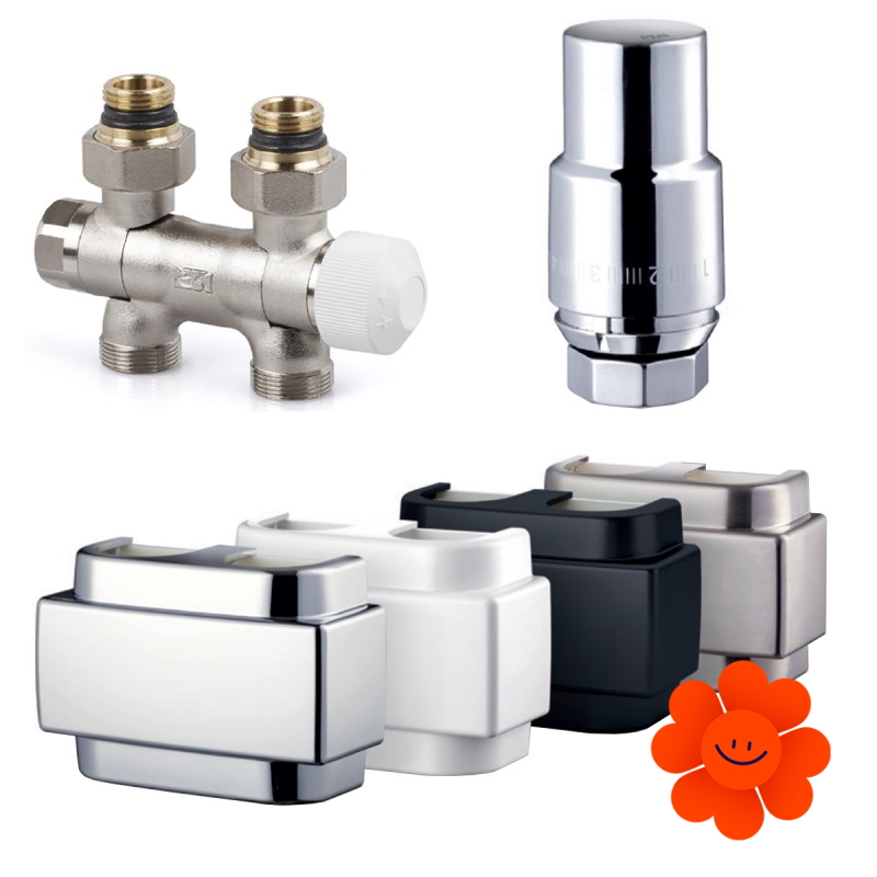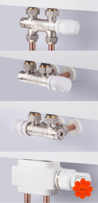 Sie können den Kopf entweder rechts oder links einstellen. In diesem Set wird das Ventil zusammen mit vier Rohranschlüssen (zwei für die Montage als Eck- und zwei als Durchgangs-Form), Heizkörperanschlüsse G1/2und Thermostatkopf geliefert.