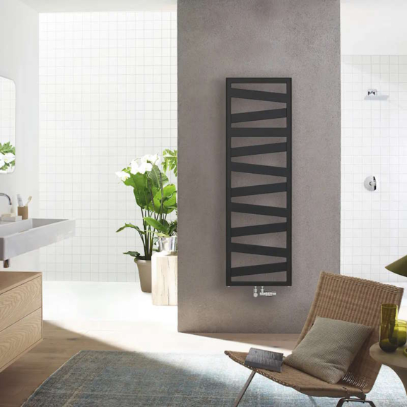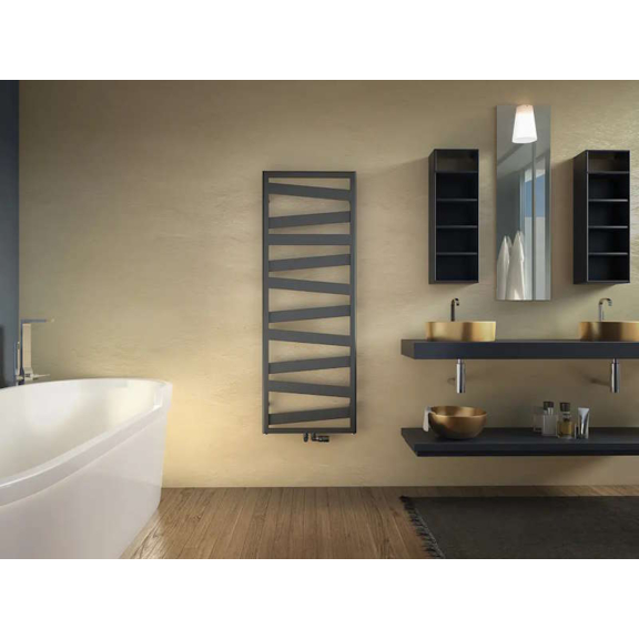 Zwei Reihen diagonal angeordneter Flachrohre verleihen dem Heizkörper ein modernes und innovatives Aussehen, das zudem ein effizientes Handtuchtrocknen ermöglicht.